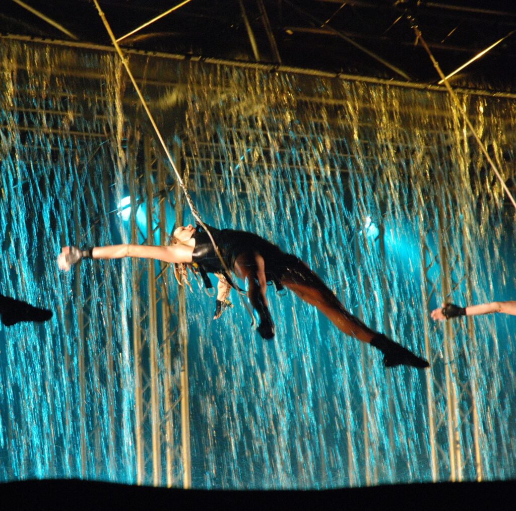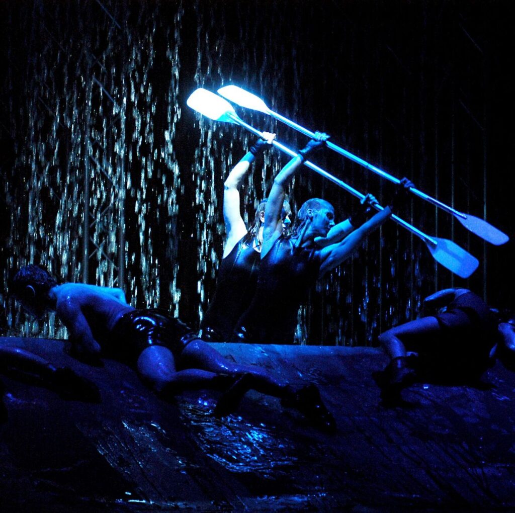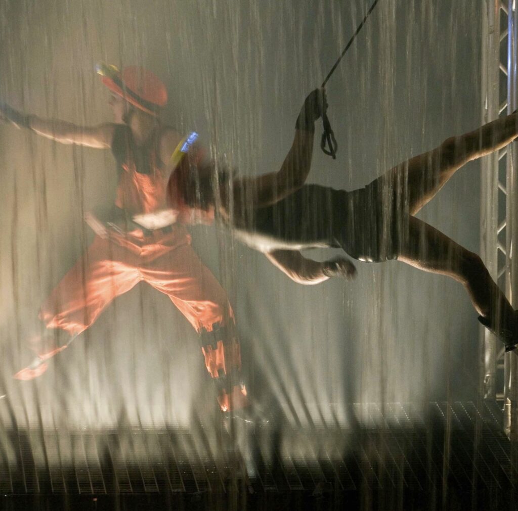La macchina scenografica è costituita da un’imponente struttura metallica da cui ha origine l’impetuosa cascata d’acqua con cui i danzatori/acrobati si confrontano. Imbracature, corde elastiche, altalene e impianti oleodinamici amplificano i movimenti degli artisti, effetti di luci e ombre modellano il flusso dell’acqua, lo mutano da velo trasparente a muro quasi impenetrabile piegandolo a un’inedita spettacolarità.